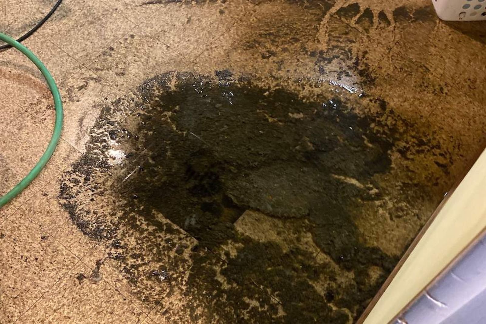 This water contains some chemicals or germs. It might come from a dishwasher or a washing machine overflow.